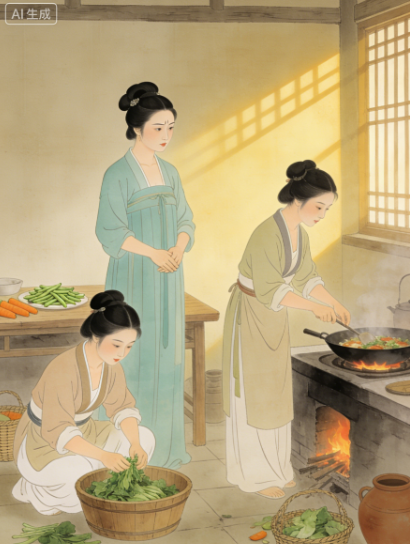 请安结束后,即刻进入 “操持家务” 的核心环节,“主中馈”(打理饮食)是古代女子的核心职责,也是衡量“贤妻”的重要标准。